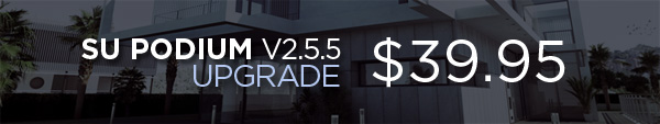 Final days! The upgrade price from SU Podium V2 to V2.5.x is increasing from $39.99 to $59.99 on March 31st, so this is the final opportunity to update at the lower rate. V2.5.5 and higher includes a much faster C++ method for processing senes, Podium panoramas, and several bug fixes. Upgrade here.